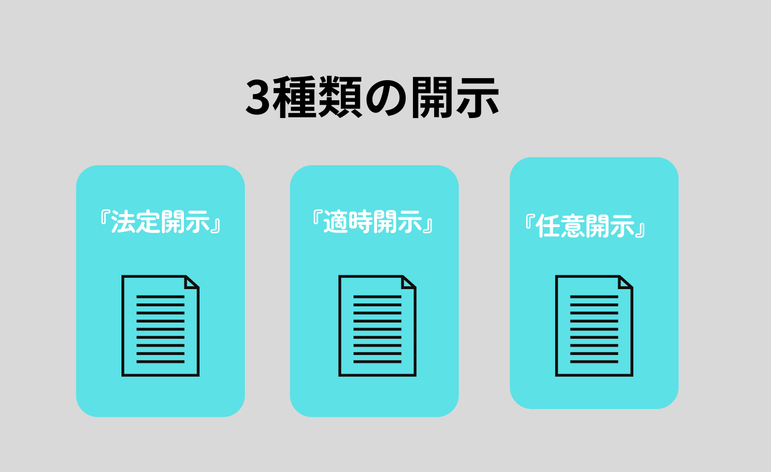 IRの情報は大きく分けて 『法定開示』『適時開示』『任意開示』 の3種類の開示があります。