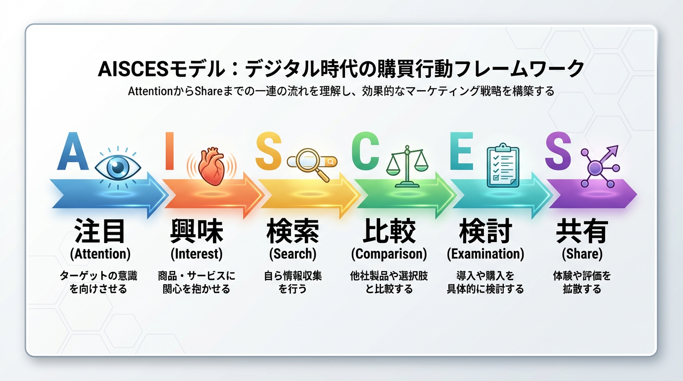 この行動は、AIDMAやAISAS、AISCES(比較・検討・共有まで含めた購買行動モデル) といったマーケティングフレームワークにも、きれいに当てはまります。