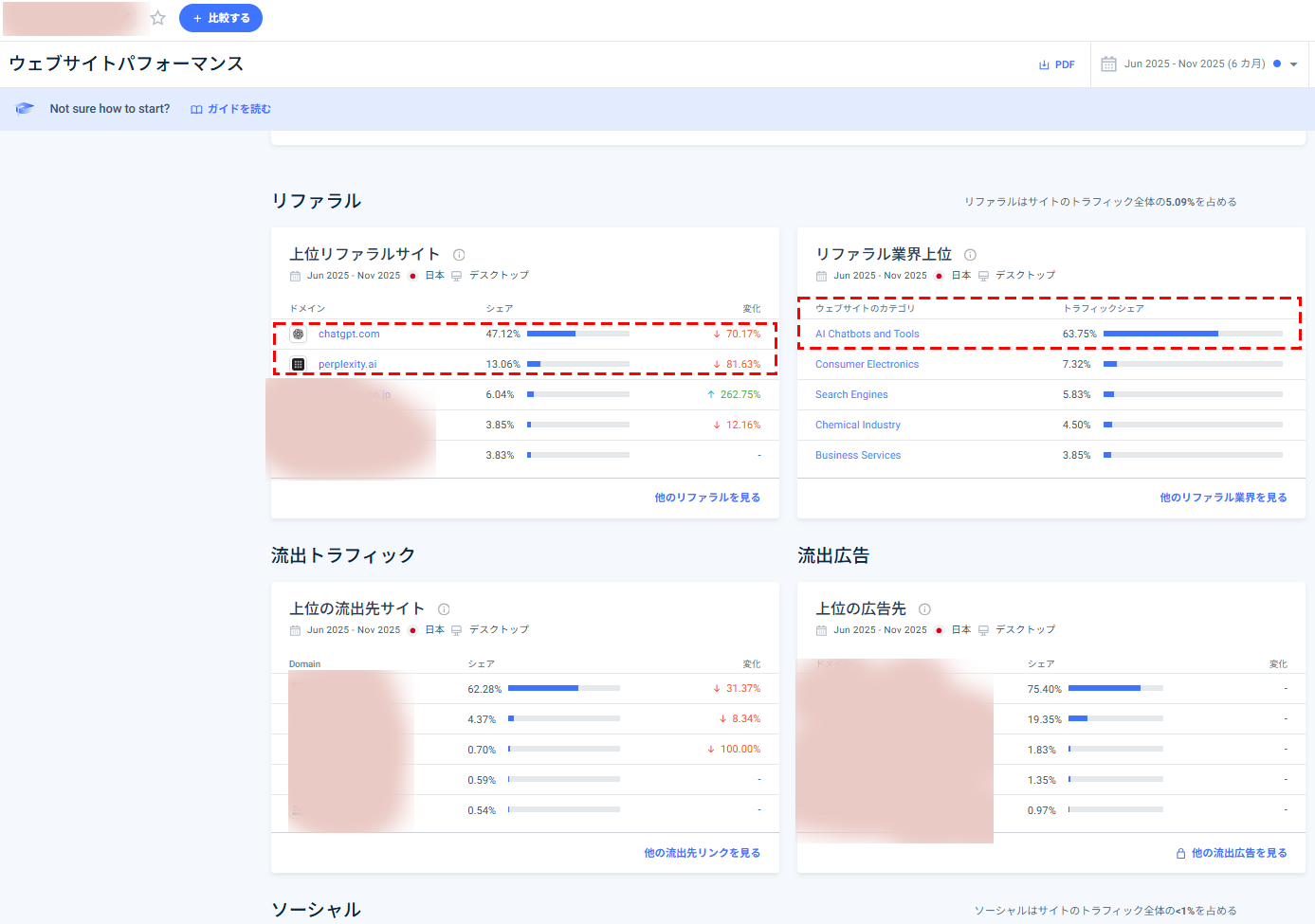 上記はとある情報ポータルサイトであり、一般的な企業サイトよりも生成AIの引用影響を受けやすいタイプのサイトではありますが、このように生成AI流入としてトラフィックとしてシェアを占めている事が窺えます。